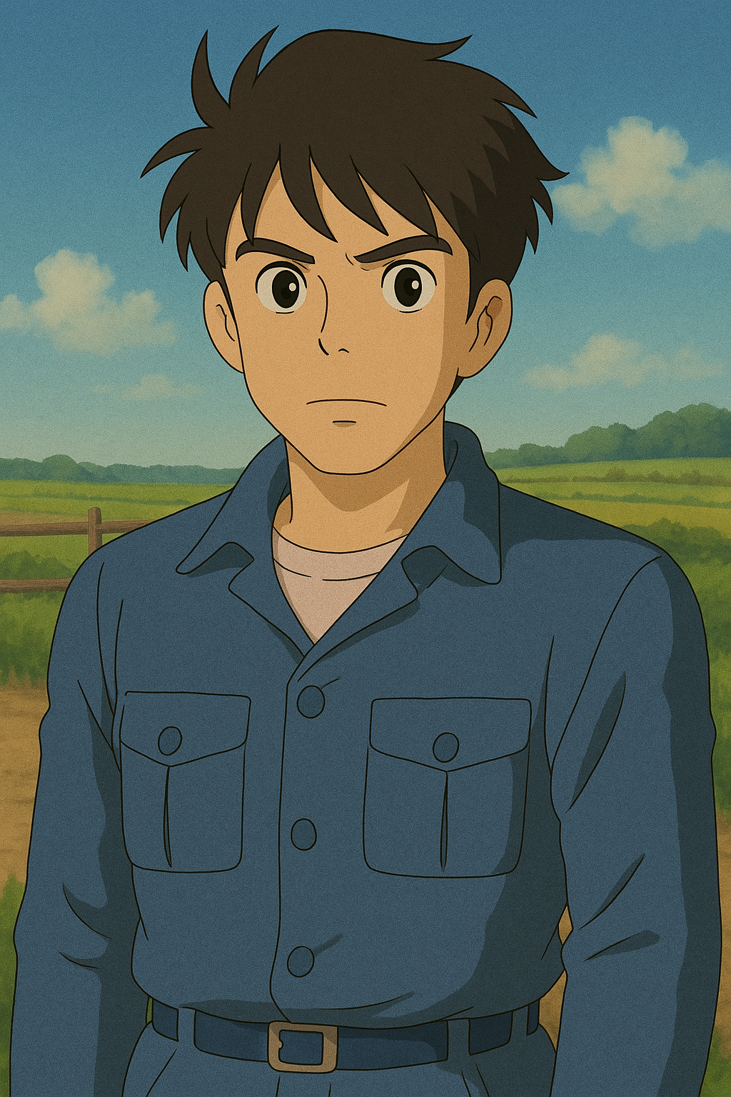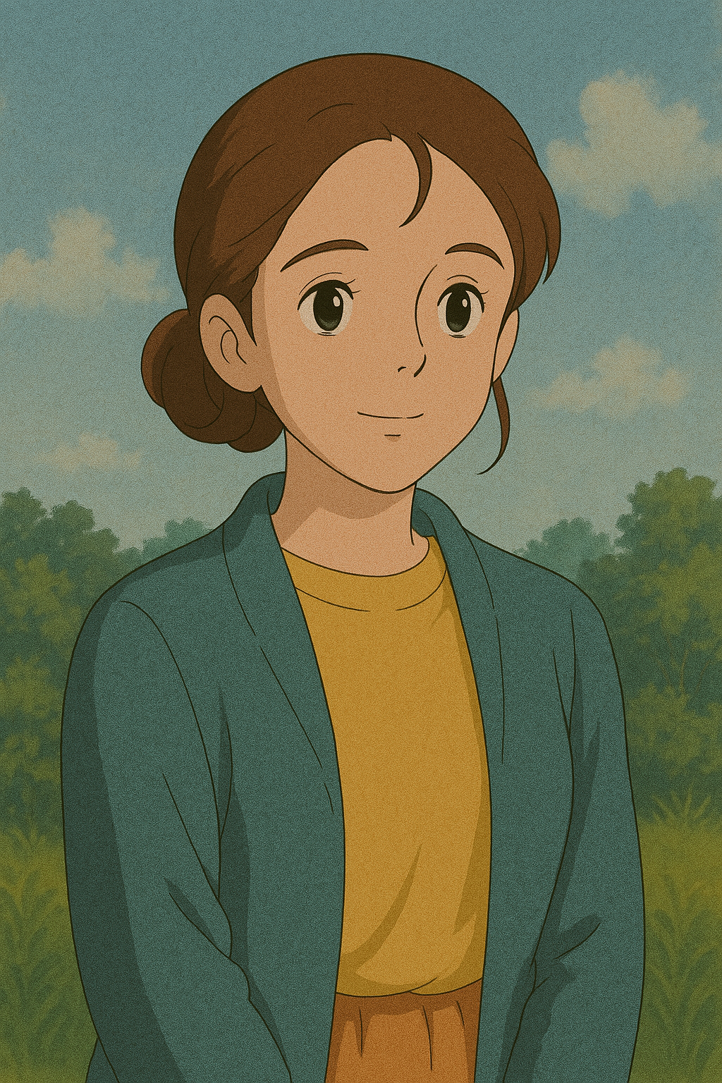 이 사진 속 인물을 참고해서 지브리풍 애니메이션 스타일의 초상화를 만들어줘. 따뜻한 배경과 부드러운 색감을 넣어줘.
