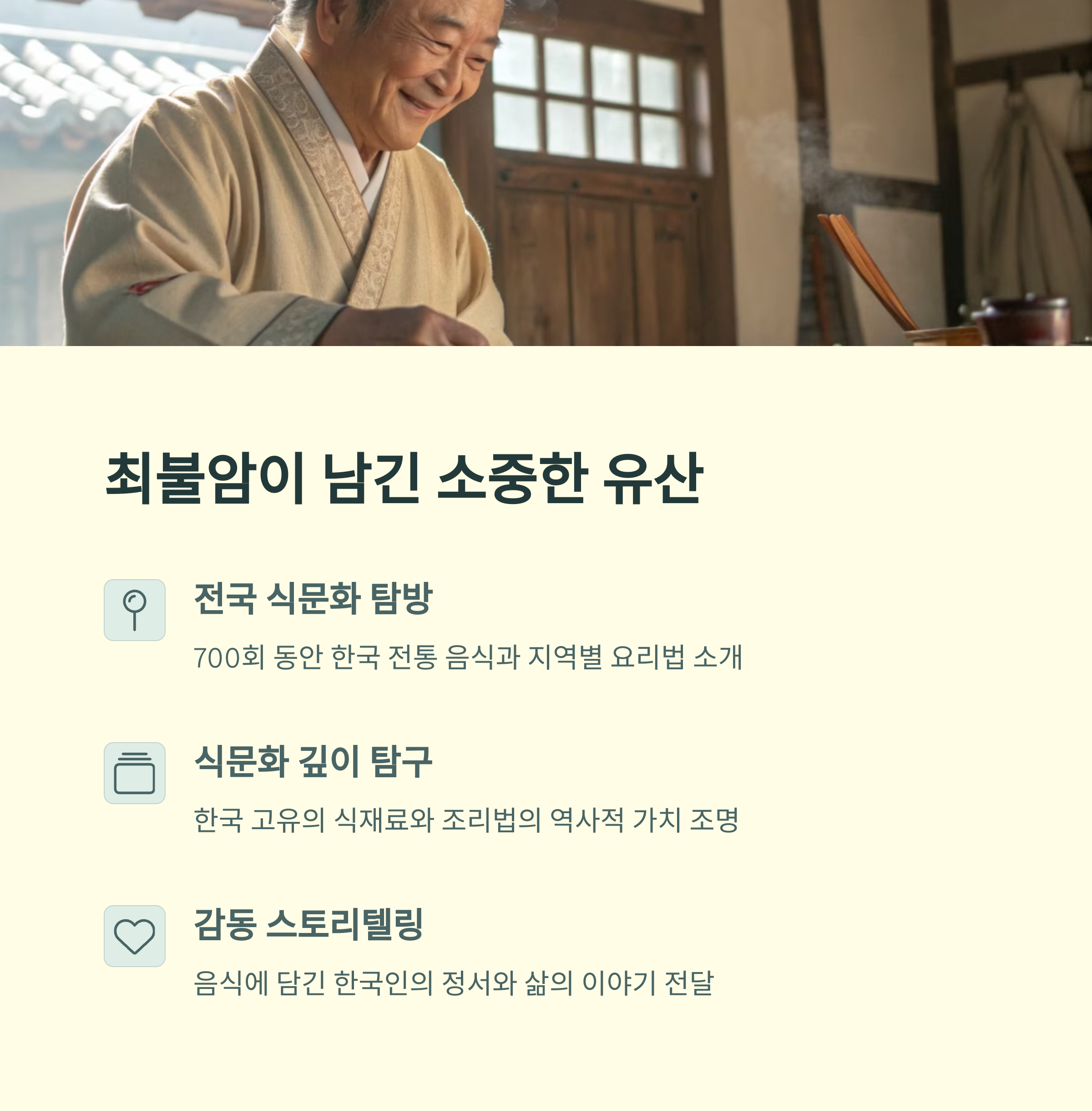 제작진은 “최불암 선생님은 언제나 ‘우리는 음식을 찍는 게 아니라, 사람을 찍는 거다’라고 말씀하셨다”고 회상했습니다. 프로그램의 핵심이 음식에 있지 않고, 그 음식을 둘러싼 사람들의 삶에 있다는 철학이었죠.