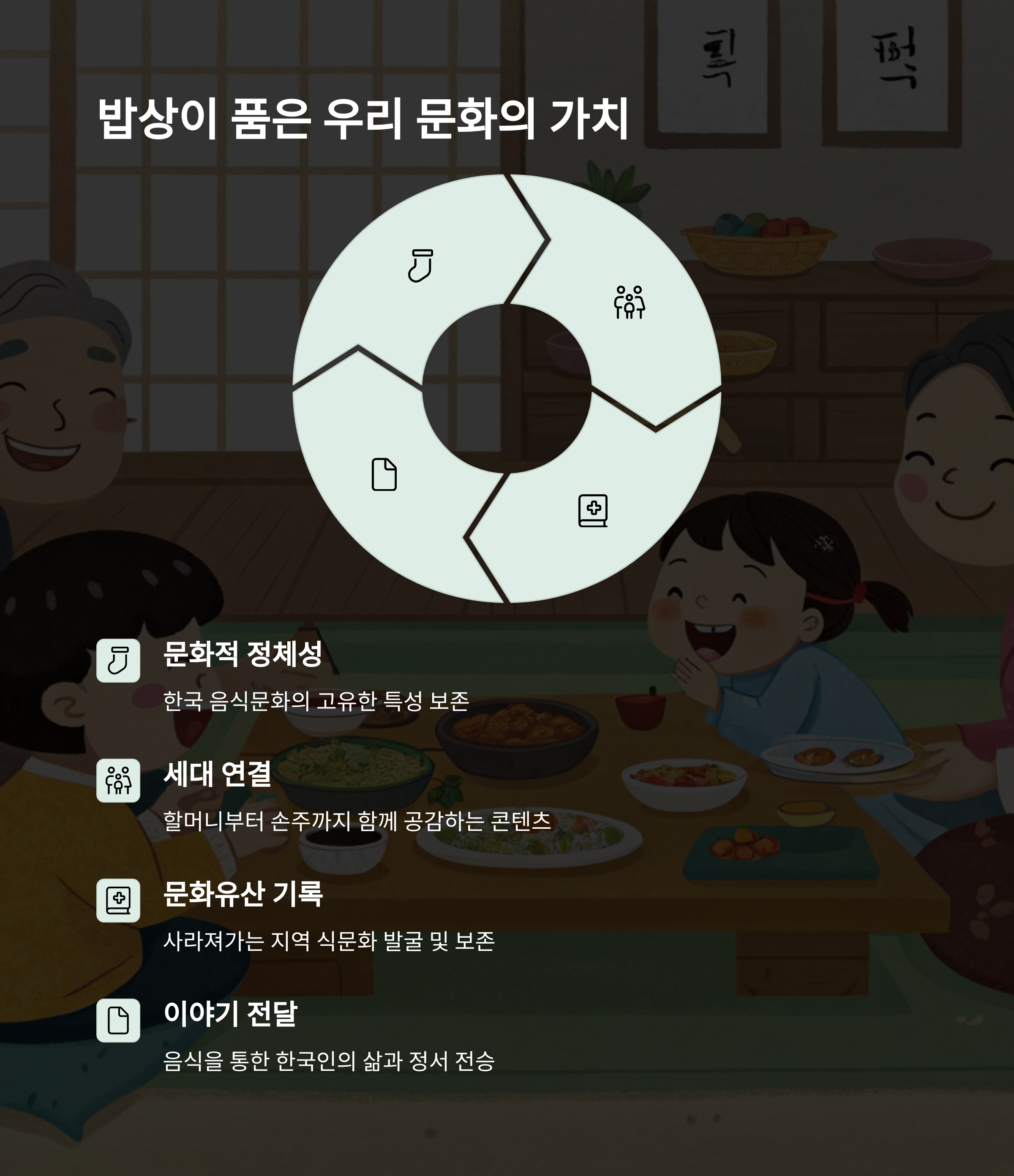 밥상은 단순한 식탁이 아닙니다. 한 사람의 기억이고, 한 가족의 역사이며, 우리 모두의 삶을 담고 있는 자리입니다.